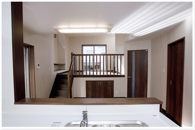 その上がリビングです。一段上ったスペースの大きな窓からは光が奥のキッチンまで届きます。 小さな子供さんが遊ぶ姿を見渡せます。 |